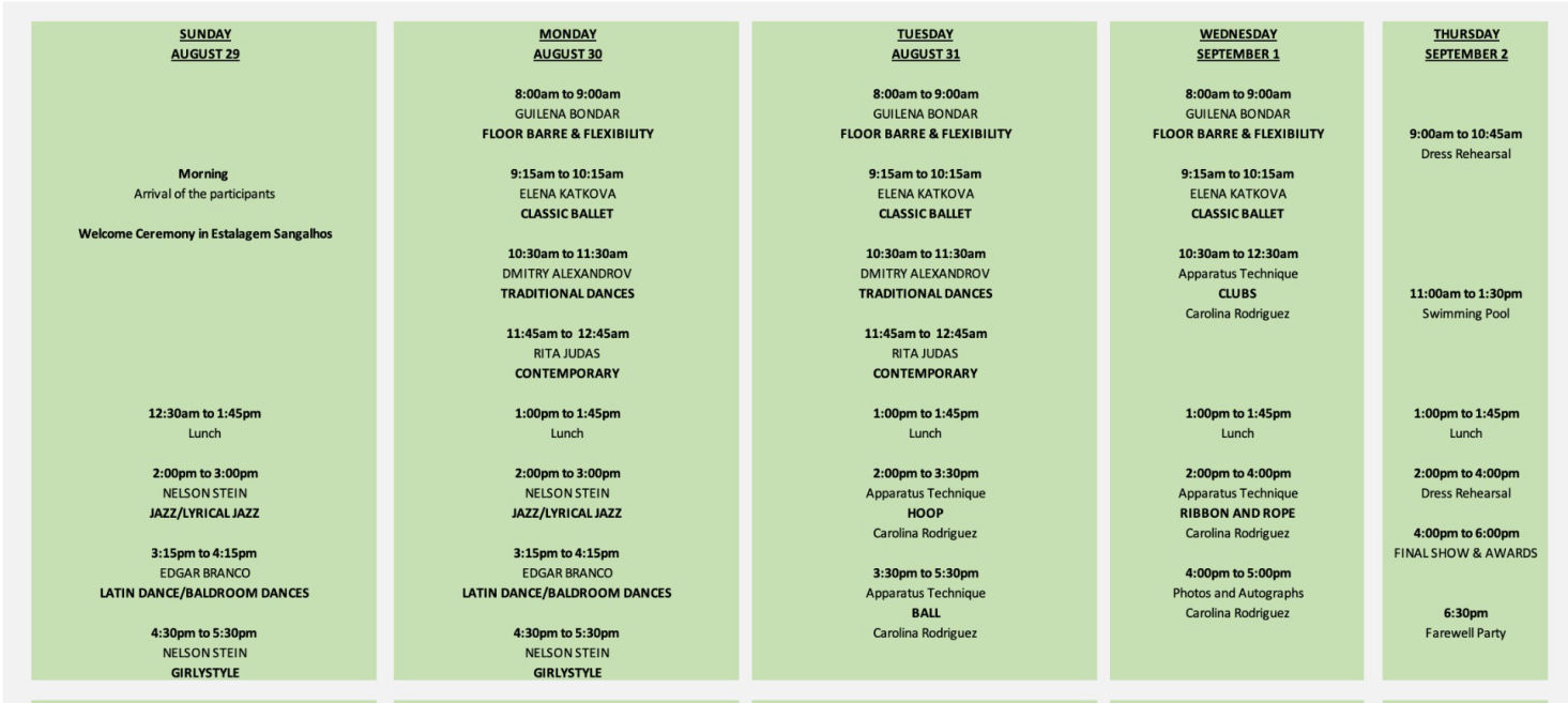 ✔ FAREWELL PARTY: The final banquet and farewell party will be at Monday after the competition. It´s included for all participants. The inscription must be done at nominative form.